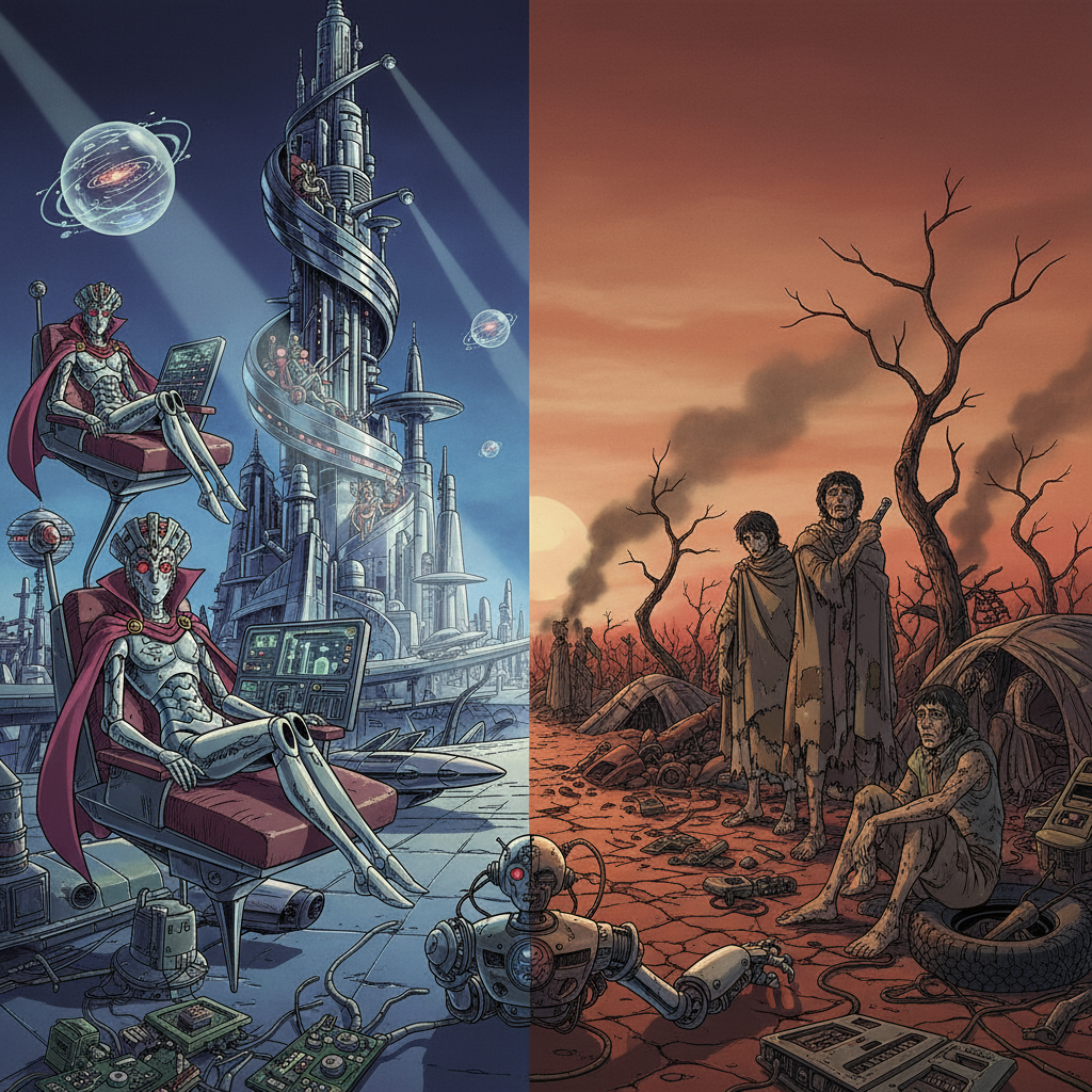 A: 本質的には同じ「技術による人間の拡張と格差の問題」です。銀河鉄道999 格差社会の機械化は身体の拡張でしたが、現代のAIは知能の拡張です。どちらも技術へのアクセスが社会的地位を決定し、持つ者と持たざる者の格差を生み出す点で共通しています。